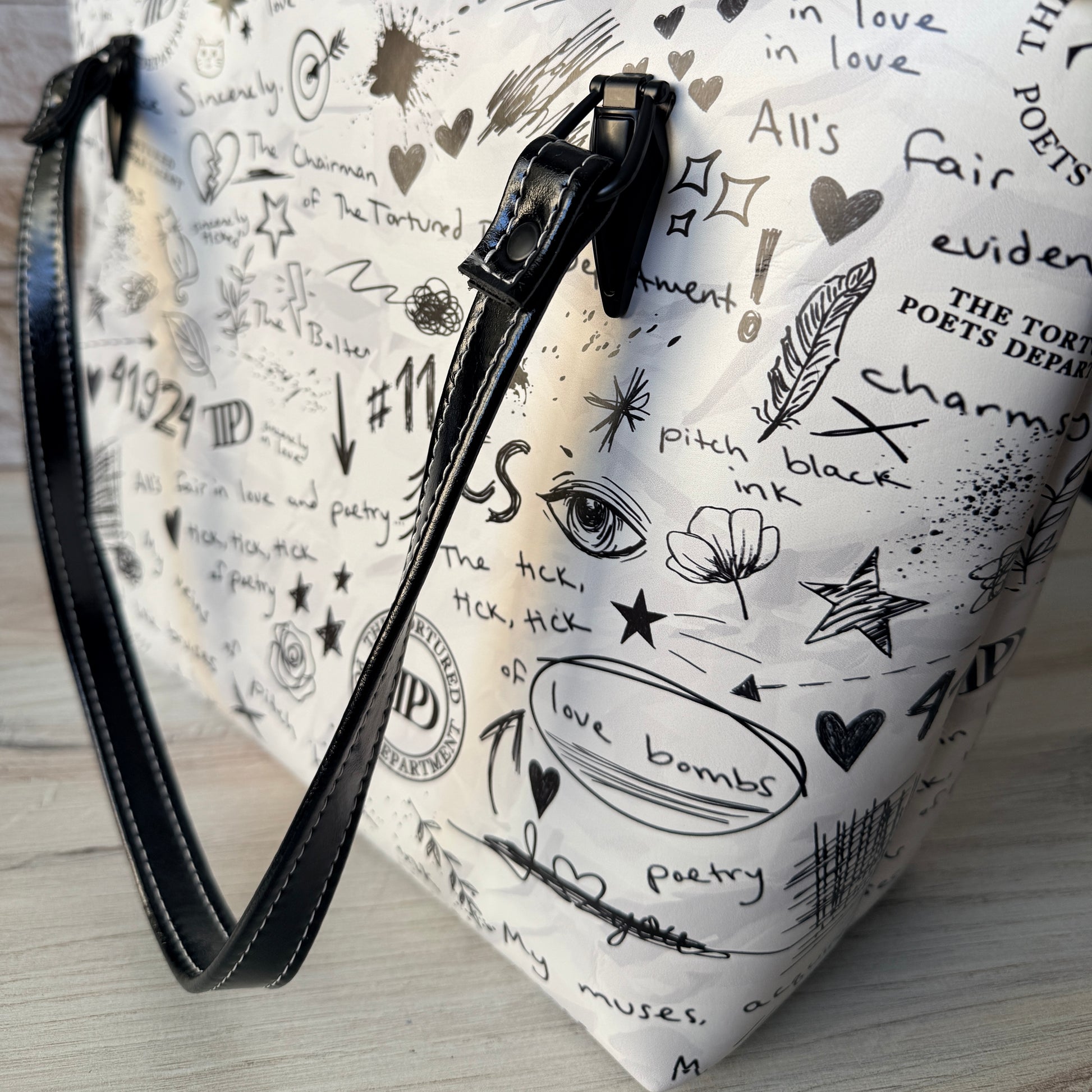 This modified Taylor Tote features themed vinyl fabric with coordinating accents, like that fun piano keys zipper tape! Inside features a unique slip pocket. You'll love how roomy this tote is!